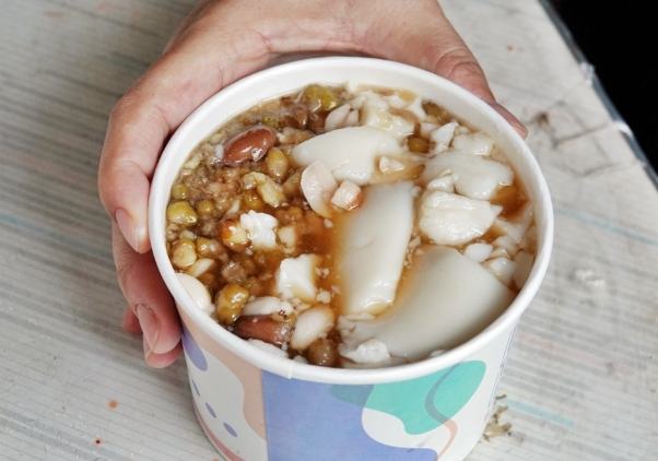 - 介紹: 在悶熱的市場裡穿梭,看到這位阿婆的小攤,就像看到綠洲!攤位上最吸睛的就是那一大盆黃澄澄、晶瑩剔透的手工粉粿,以及用傳統木桶裝著、質地綿密細緻的豆花。配料常見的有煮得軟爛的花生、飽滿的紅豆、Q彈的珍珠。糖水是傳統的熬煮蔗糖,甜而不膩。特別推薦點綜合豆花+粉粿,粉粿那獨特的Q勁和淡淡黃梔子香氣,配上滑嫩的豆花,淋上冰涼糖水,一口下去瞬間暑氣全消! 阿婆動作不快,但很認真對待每一碗,是記憶中阿嬤的味道。天氣熱時總要排隊,但值得。