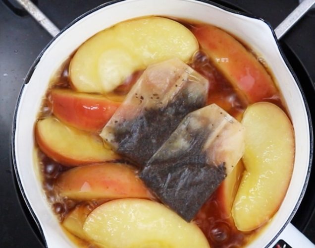這個方法適合擔心茶味會澀、想要茶感更溫潤柔和的人。原理是先泡好冷泡茶當基底,再煮蘋果。